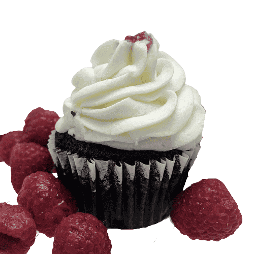 This heavenly chocolate cupcake has a raspberry surprise inside, topped with vanilla frosting and a raspberry dot.